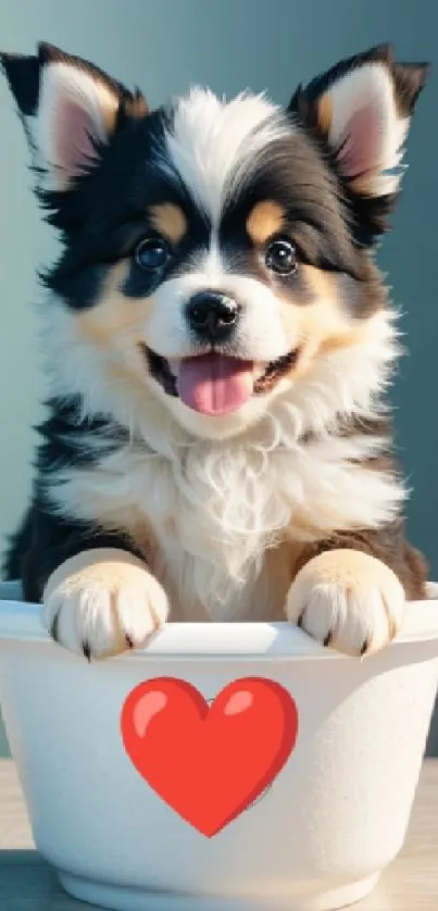Download this charming mobile wallpaper featuring a fluffy puppy in a pot with a red heart design, perfect for pet lovers seeking cute and heartwarming phone backgrounds
