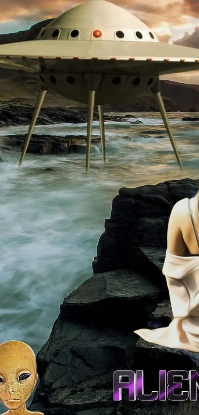 Explore a captivating alien landscape with a mysterious visitor, featuring a UFO hovering over serene waters. This mobile wallpaper blends science fiction and fantasy, making it a perfect backdrop for enthusiasts. Dive into an otherworldly adventure with this sci-fi inspired artwork