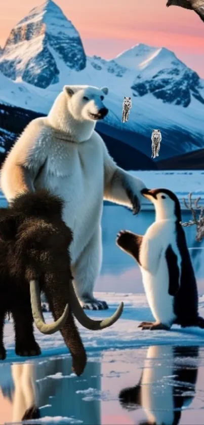 Explore an epic Arctic wildlife fantasy wallpaper with diverse animals like polar bears, penguins, and mammoths, set against majestic icy mountains and serene waters