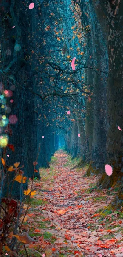 Experience the tranquil beauty of an autumn forest pathway with vibrant fall leaves and towering trees. This captivating mobile wallpaper is perfect for nature lovers and those seeking a serene, colorful background