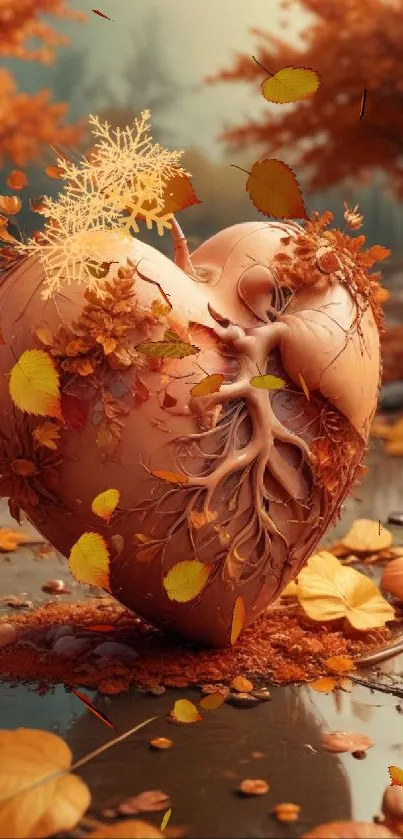 Explore a surreal autumn heart in a mystical forest setting, blending nature's charm with artistic fantasy in this striking mobile wallpaper