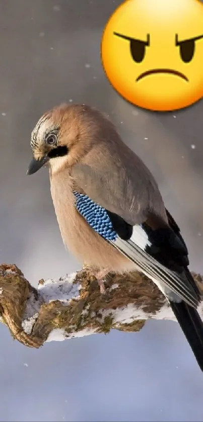 Download this unique bird wallpaper featuring a Eurasian Jay perched on a snowy branch with an angry emoji overlay, perfect for adding character and emotion to your mobile screen