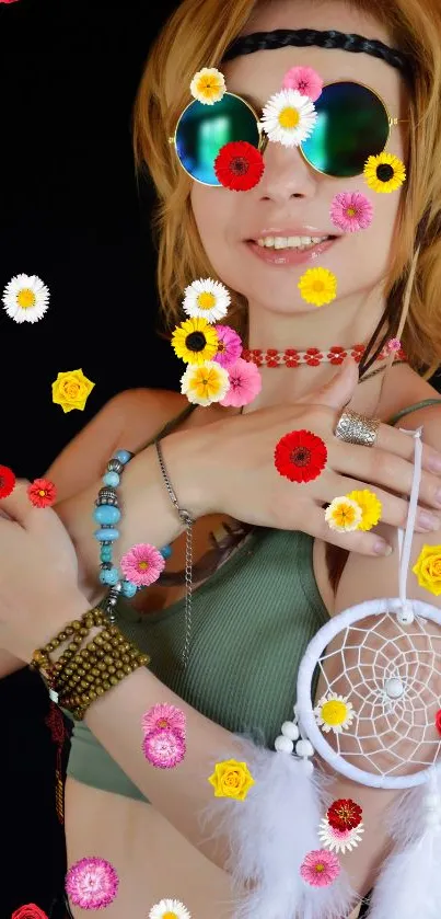 Enhance your device with this vibrant bohemian mobile wallpaper featuring colorful floral designs and artistic accessories, perfect for adding a touch of nature-inspired charm