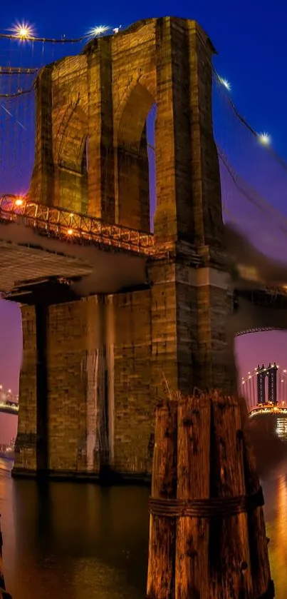 Download this stunning Brooklyn Bridge at Twilight mobile phone wallpaper, capturing the iconic structure illuminated against a vibrant evening sky, perfect for adding a touch of urban elegance to your device