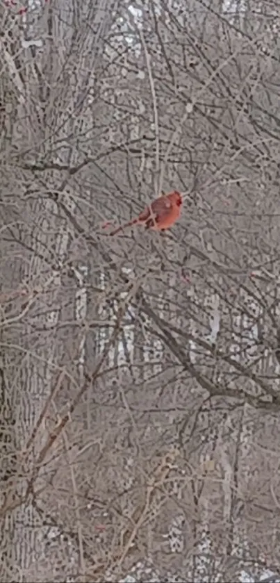 Discover the serene beauty of a vibrant cardinal perched amid bare winter trees, offering a striking contrast of red against a muted forest backdrop, ideal for nature-inspired wallpapers