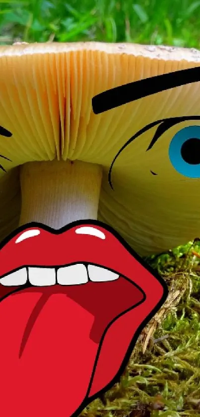 Discover a playful mobile wallpaper featuring a cartoon-animated mushroom face in a woodland setting, perfect for adding a touch of whimsy to your phone's background