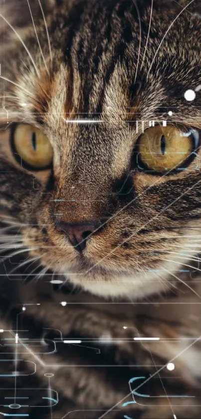 Explore a captivating mobile wallpaper featuring a close-up of a cat with an intriguing futuristic overlay, ideal for cat lovers and tech enthusiasts seeking unique backgrounds