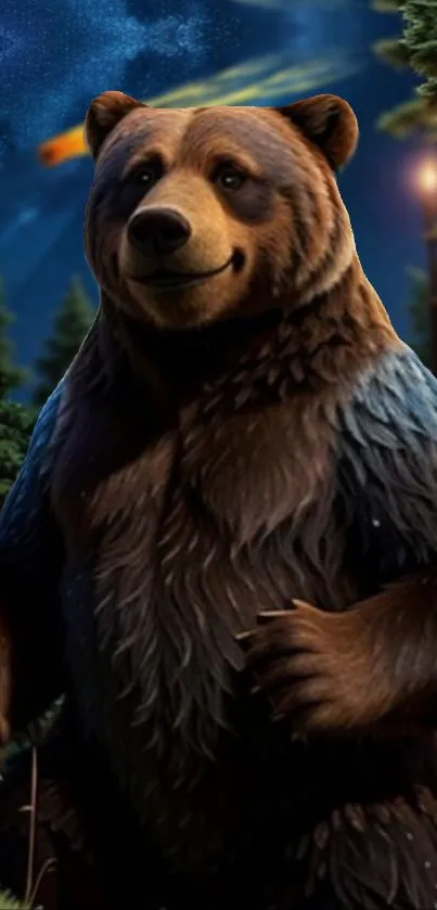 Discover a whimsical bear in a nighttime enchanted forest, ideal for nature-themed phone wallpapers
