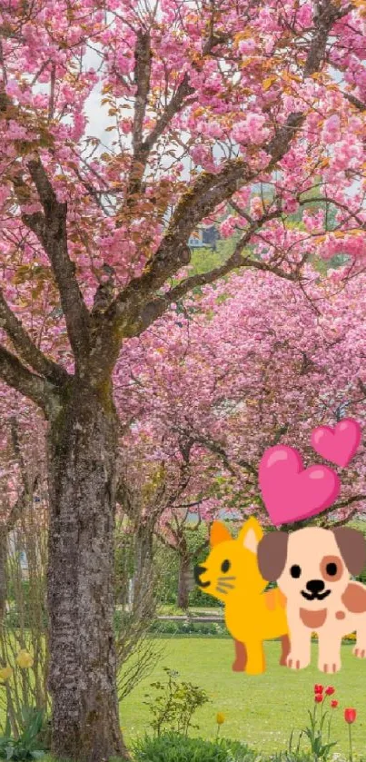 Discover a romantic mobile phone wallpaper featuring a charming cartoon couple amidst vibrant cherry blossom trees, bringing a touch of nature's elegance to your screen