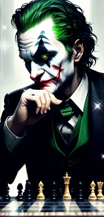 Elevate your phone's appearance with this captivating wallpaper featuring a clown in bold makeup engrossed in a strategic chess game, set against a dramatic backdrop. Perfect for those who appreciate intriguing art and intense emotions