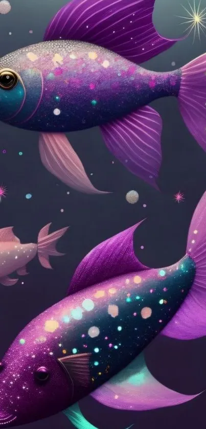 Explore the enchanting design of colorful cosmic fish swimming in a deep, starry background, perfect for brightening up your phone display