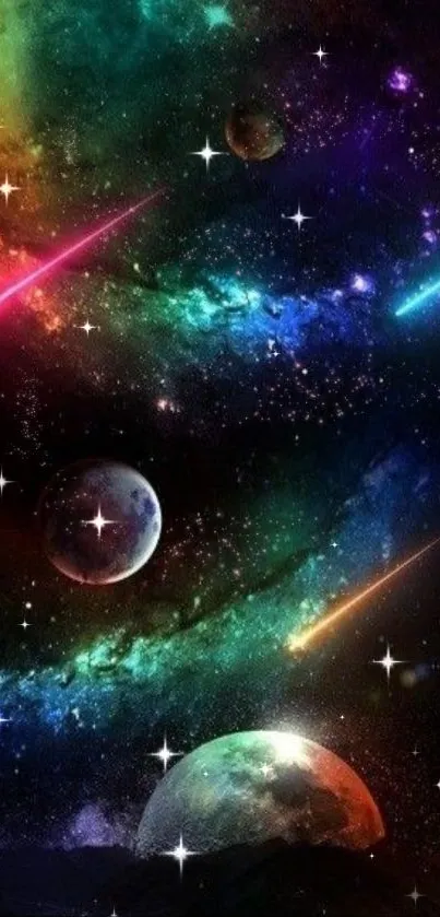 Explore the vibrant and captivating universe with this colorful cosmic space wallpaper, featuring planets, stars, and galaxies in a mesmerizing display of colors perfect for your mobile background