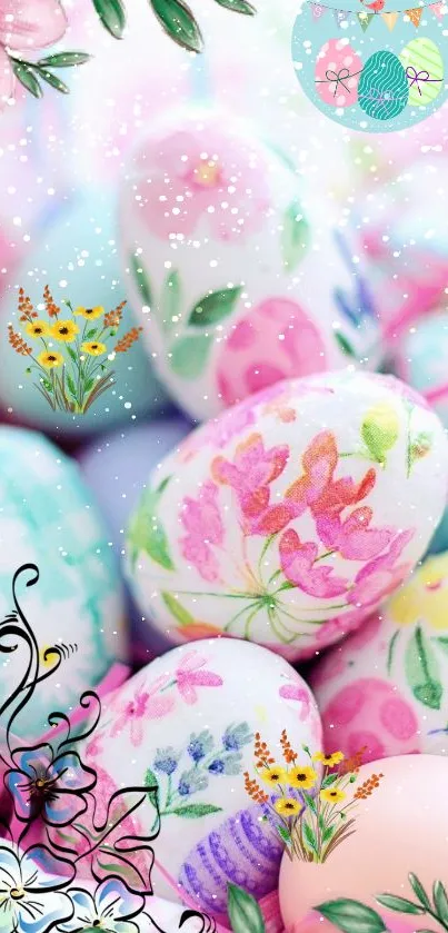Download this vibrant Easter egg wallpaper, featuring a delightful assortment of colorful and intricately decorated eggs in a floral basket, perfect for celebrating spring and Easter