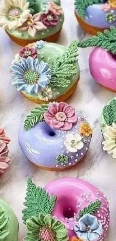 Experience a vibrant world with this floral-themed mobile wallpaper, showcasing beautifully decorated donuts in pastel hues, ideal for adding a splash of color to your screen