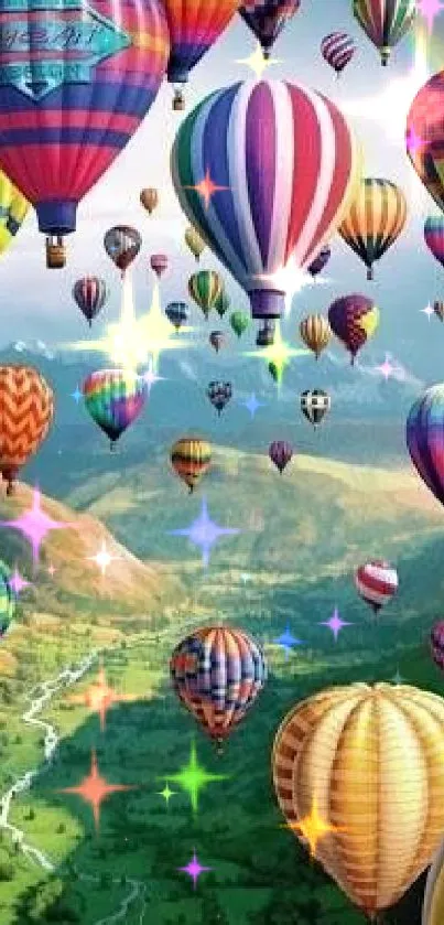 Bright and vibrant mobile wallpaper featuring colorful hot air balloons floating over scenic landscapes, ideal for a lively and uplifting phone background