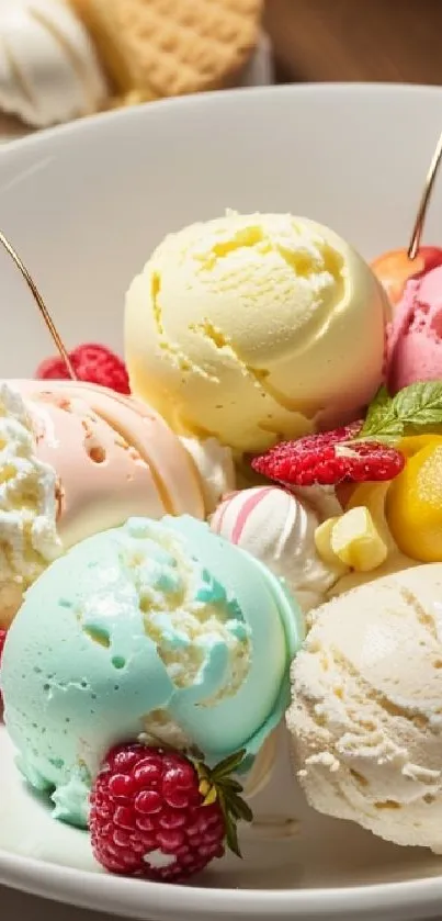 Indulge in a vibrant ice cream bowl showcasing various flavors and fresh fruits for a sweet mobile wallpaper