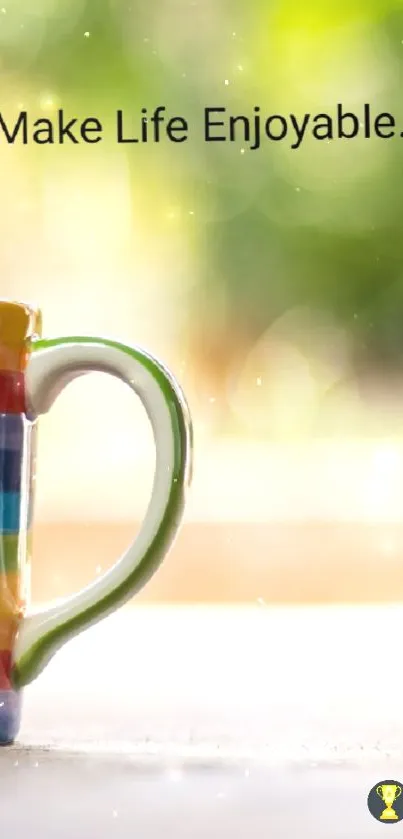 Download a vibrant mobile wallpaper featuring a rainbow-striped mug with the motivational quote "Make Life Enjoyable." Perfect for adding color and inspiration to your phone screen, this design combines a cheerful motif with a positive message against a bright, serene background