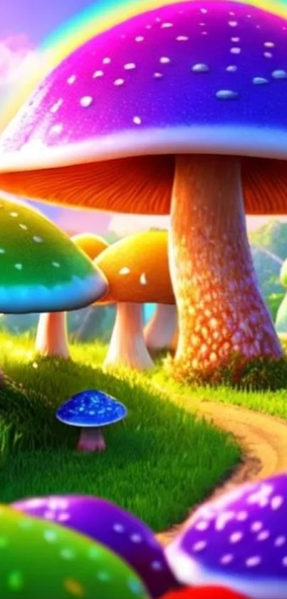 Explore a vibrant fantasy landscape with colorful, giant mushrooms and a rainbow arc in this enchanting mobile wallpaper