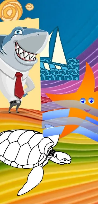 Vibrant ocean-themed mobile wallpaper featuring playful cartoon shark, turtle, and starfish art on a rainbow background