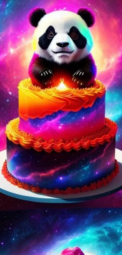 Explore a vibrant panda-themed mobile wallpaper featuring a whimsical cake with cosmic colors, perfect for brightening your screen with a splash of playful art and color. Ideal for panda and cake enthusiasts searching for unique digital decoration