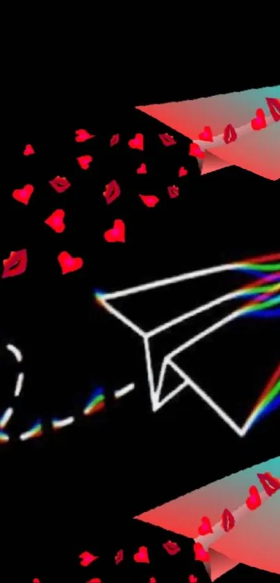 A captivating mobile wallpaper featuring a vibrant paper plane with psychedelic trails against a dark background, decorated with floating red hearts