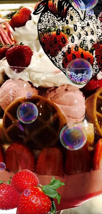 Indulge in the vibrant colors of a strawberry dessert wallpaper, featuring whipped cream, waffles, ice cream scoops, and an artistic strawberry overlay, perfect for adding a sweet and lively touch to your mobile screen