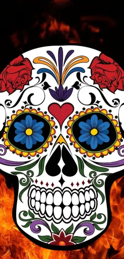 Vibrant sugar skull wallpaper featuring intricate floral designs and vivid colors on a fiery backdrop