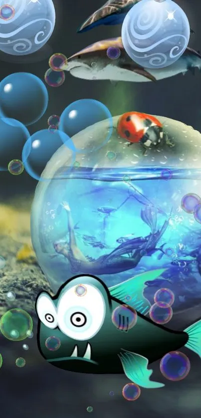Dive into a colorful underwater world with this surreal fish fantasy wallpaper, featuring vibrant aquatic creatures and whimsical bubbles against a dreamy background, perfect for mobile screens