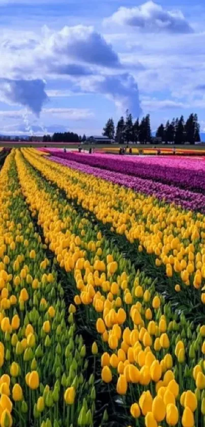 Explore this vibrant mobile wallpaper featuring colorful tulip fields under a bright blue sky, perfect for adding a touch of nature and beauty to your device