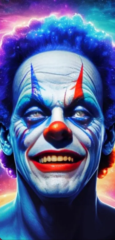 Download this vibrant clown wallpaper, featuring a cosmic background in vivid colors for a lively, artistic mobile experience