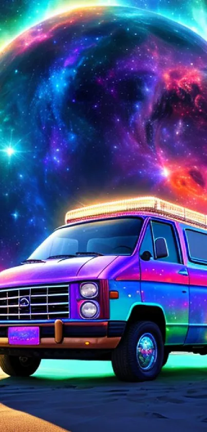 Explore a psychedelic scene with a colorful van parked on a beach under a vivid cosmic sky, perfect for your mobile wallpaper