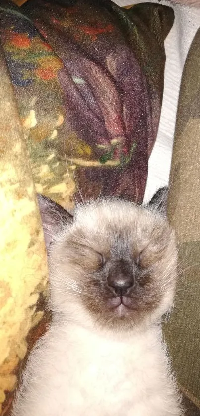 Discover a cozy mobile wallpaper of a sleeping Siamese cat nestled in vibrant, warm-toned blankets for a serene and cute phone background