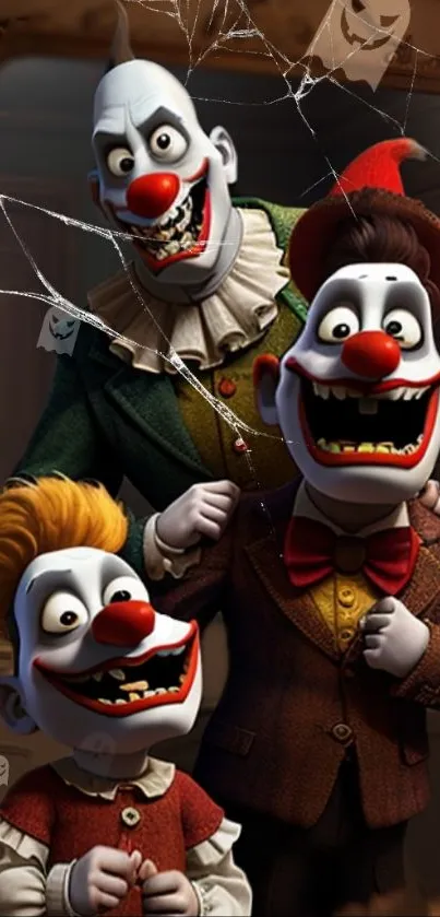 Download this eerie clown family wallpaper, featuring vibrant costumes and sinister smiles, perfect for adding a spooky touch to your device. Great for fans of horror or anyone looking to give their screen an unsettling vibe
