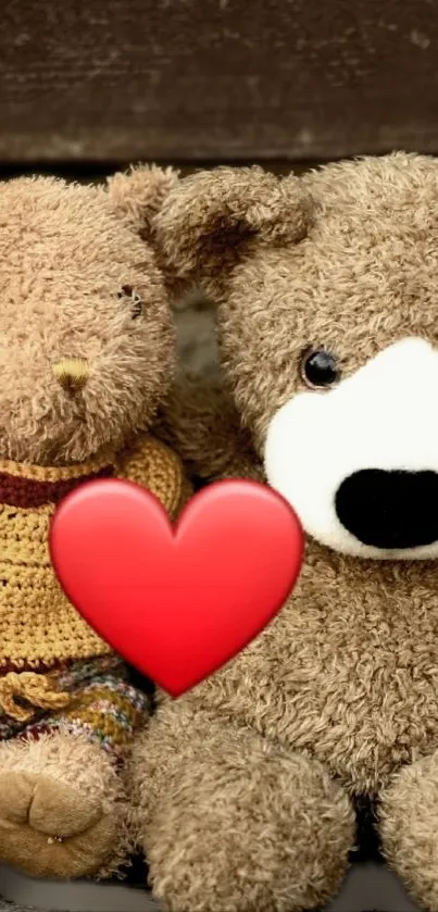 Adorable mobile wallpaper featuring a plush bear and rabbit with a red heart, perfect for creating a cozy and cute phone background