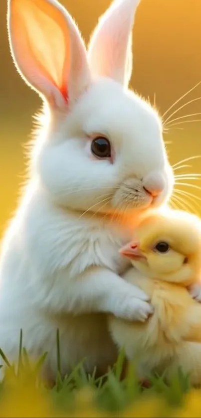 Discover the adorable charm of a fluffy white bunny hugging a small duckling, perfect for a heartwarming mobile wallpaper