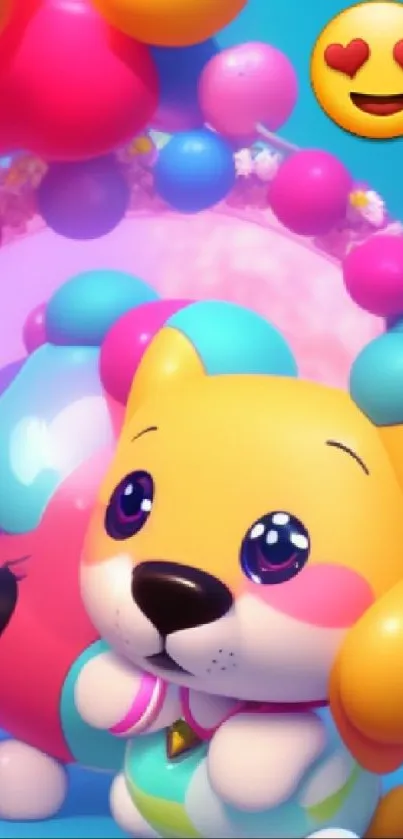 Download this adorable cartoon dog wallpaper featuring vibrant toys and heart-eye emoji, perfect for brightening any mobile screen