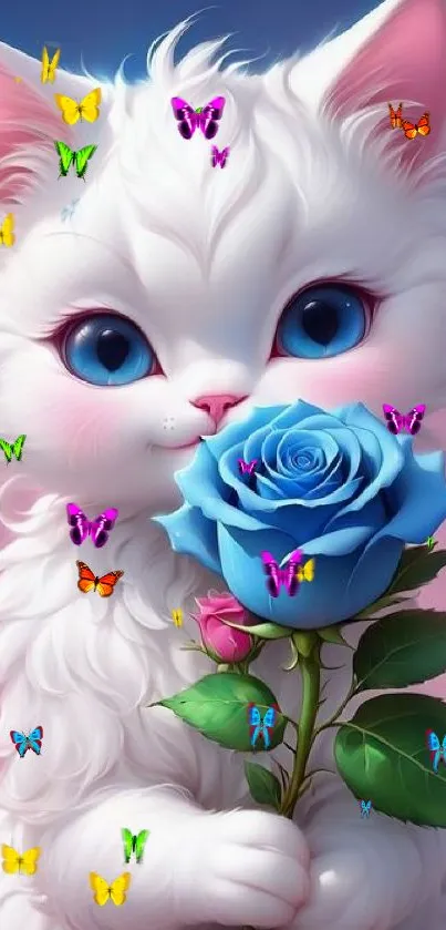Adorable white kitten with big blue eyes holds a blue rose, surrounded by vibrant butterflies on a dreamy pink background