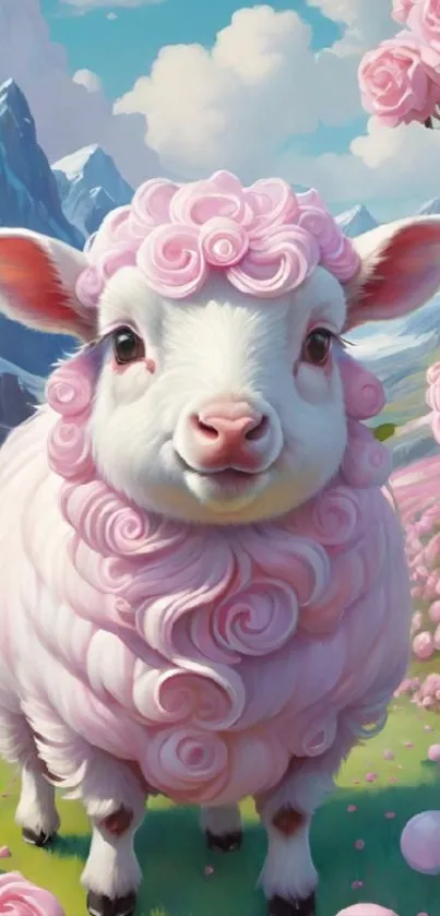 Adorable lamb with curly pink wool in a scenic mountain landscape filled with blooming flowers, perfect for a cheerful phone wallpaper