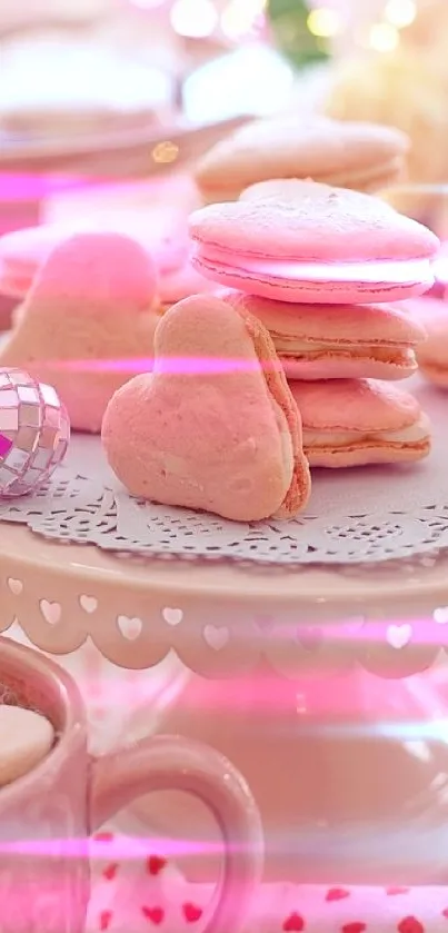 Adorn your screen with a cute pink dessert wallpaper featuring heart-shaped macarons, perfect for lovers of sweet treats and romantic themes