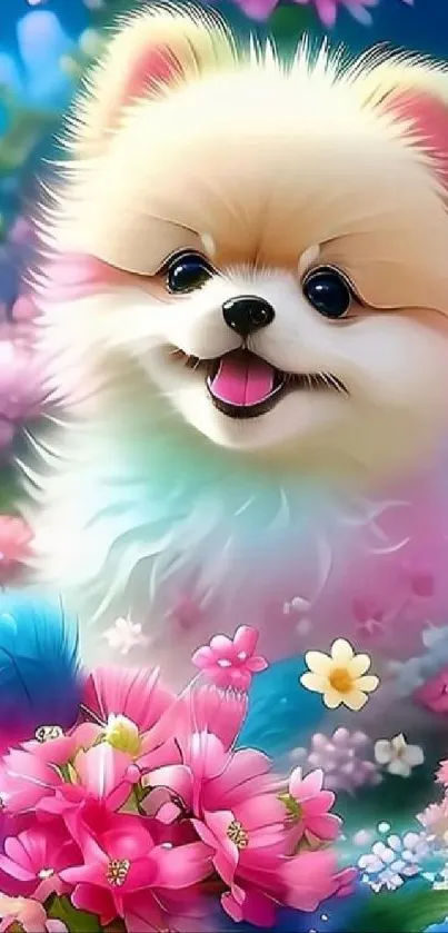 Discover a delightful mobile wallpaper featuring an adorable fluffy puppy surrounded by colorful blooming flowers, perfect for adding a cheerful and vibrant touch to your device's screen