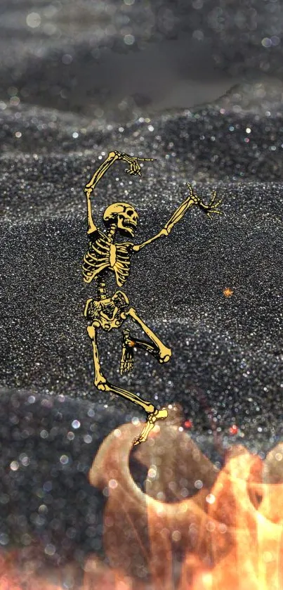 Download this dynamic phone wallpaper featuring a dancing skeleton on fiery, sparkling black sands, adding a touch of artful spookiness to your screen