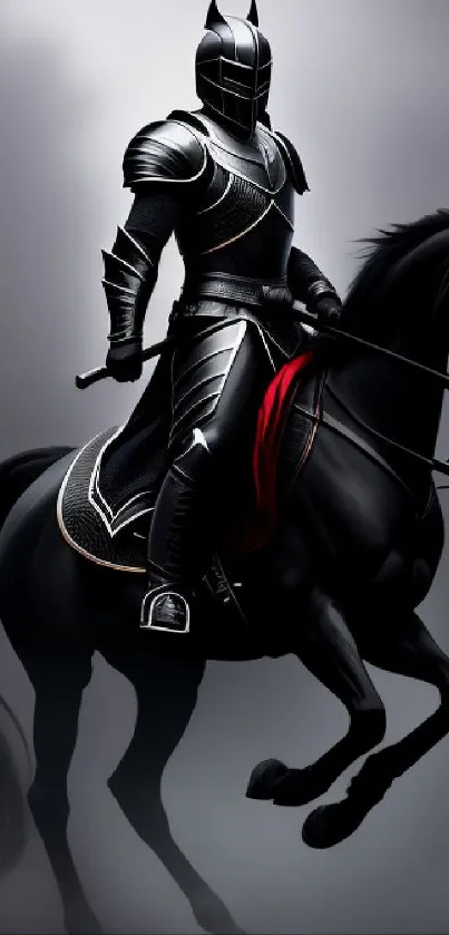 Download this stunning mobile wallpaper featuring a dark knight in full armor riding a majestic black horse, set against a moody background. Perfect for fans of medieval and fantasy themes. Ideal for creating an epic and mysterious look on your phone screen