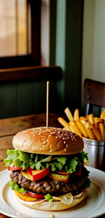 Tantalize your taste buds with this high-resolution mobile wallpaper featuring a delicious burger and crispy fries, perfect for food lovers and culinary enthusiasts seeking mouth-watering inspiration on their screens