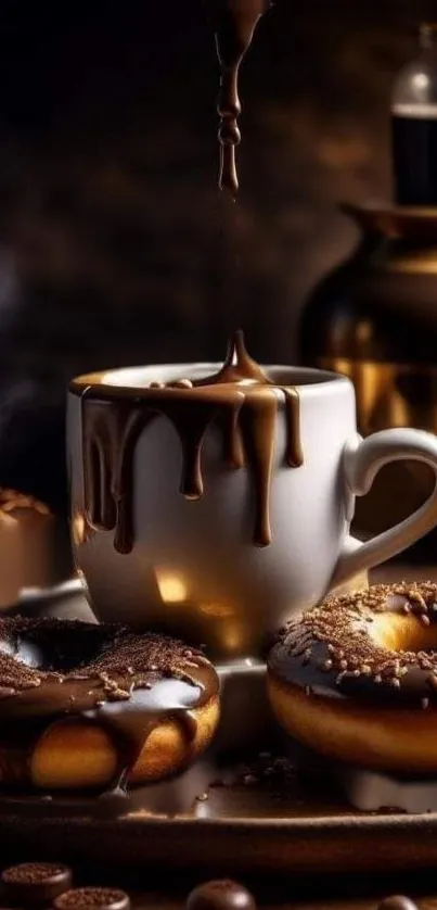 Enjoy this delectable mobile wallpaper featuring chocolate donuts and a steaming coffee cup for a cozy and indulgent feel