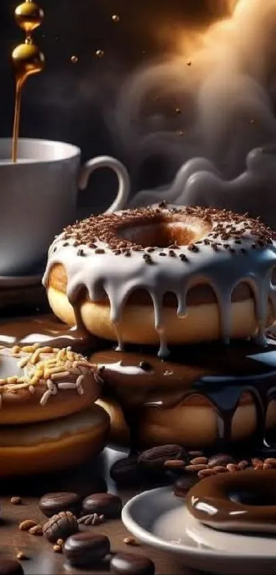 Indulge in a mesmerizing mobile wallpaper featuring a stack of delicious glazed donuts and steaming coffee, perfect for food lovers seeking a touch of sweetness on their screens
