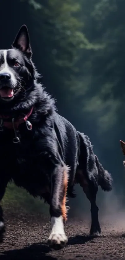Dynamic mobile wallpaper showcasing a group of dogs running swiftly through a lush forest trail, capturing energy and nature. Perfect for animal lovers and outdoor enthusiasts seeking a lively and vibrant background