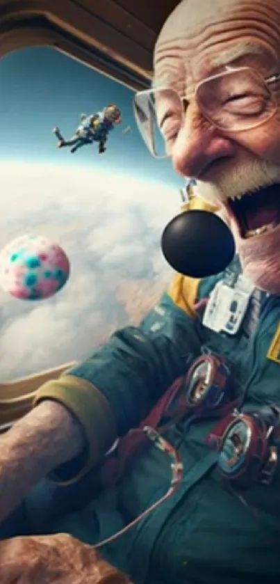 Explore a whimsical universe with this mobile wallpaper of an elderly astronaut experiencing a joyful adventure in space. Bright and imaginative design captures the endless possibilities and fun. Perfect for those who dream beyond the stars. Ideal for creative mobile screens