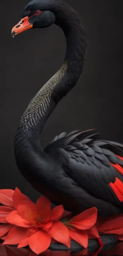Stunning black swan mobile wallpaper with vibrant orange accents and red flowers, perfect for nature and art lovers seeking elegance and beauty for their phone screens
