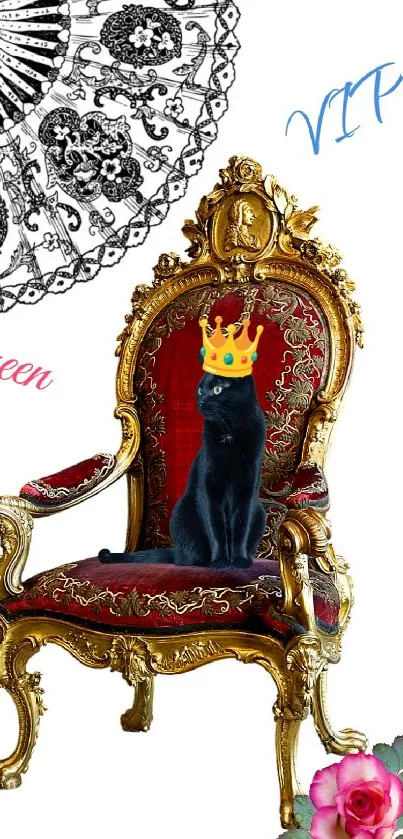 Dive into elegance with this unique mobile wallpaper featuring a regal black cat on a lavish golden throne, a delicate ornate fan, and vibrant flowers, perfect for those who love whimsical, artful designs