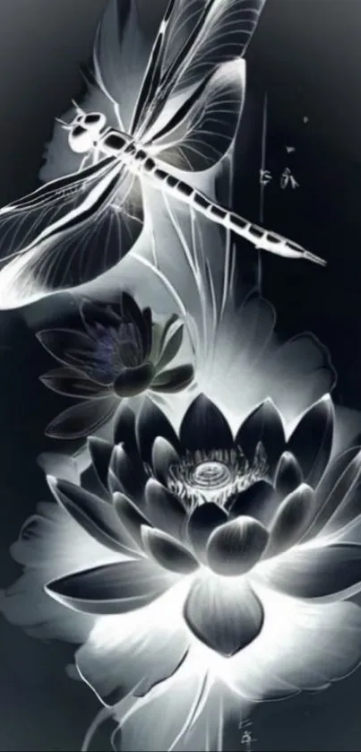 Explore this stunning phone wallpaper featuring an elegant dragonfly and lotus in monochrome art, perfect for nature lovers